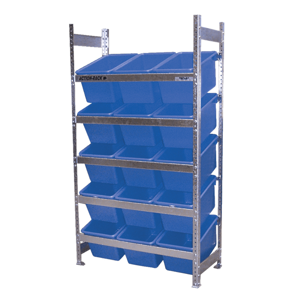 - ACTION-RACK is a unique plastic bin racking storage system designed for efficient organisation.