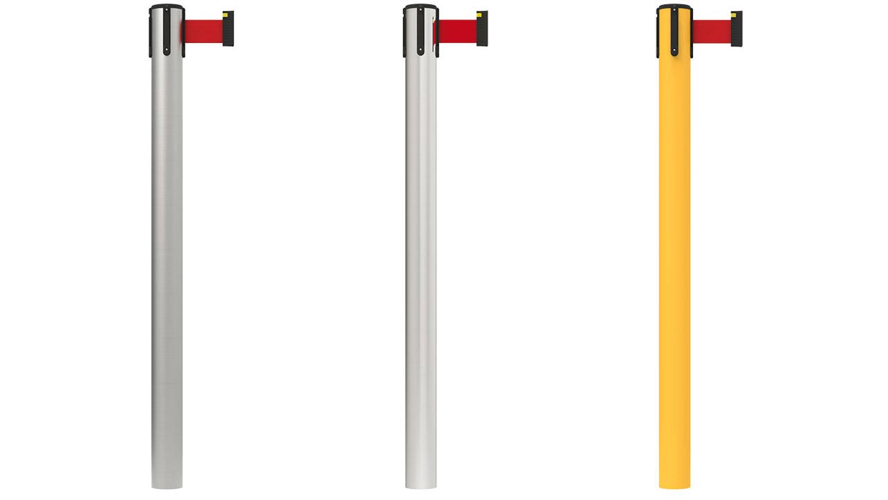 Choose from two grades of stainless steel or durable UPVC plastic. All posts are 63mm in diameter. Fixed in-floor installation using the aluminium slip post kit allows them to rotate for belt alignment while a security fixing prevents unauthorised removal. Available in a choice of six standard or four printed 3 metre belts with brake feature and self-locking clips. Slip post kits sold separately.