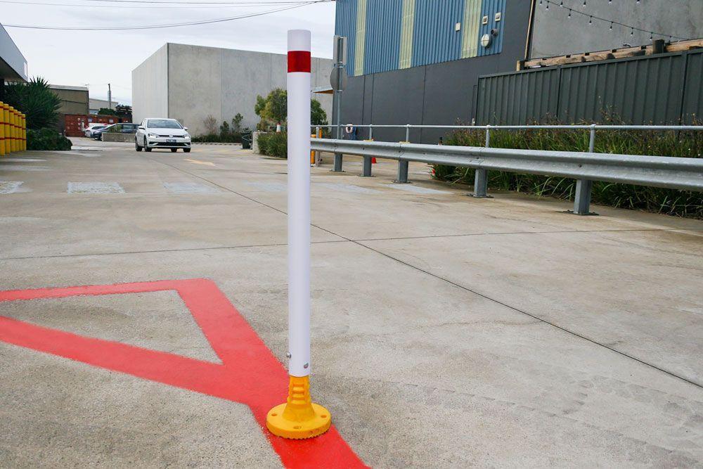 A heavy duty delineator consisting of a bolt down flexible base and fixed PVC guide post that is 60mm in diameter with a 5mm thick wall and stands 1100mm tall. The white post has a reflective band and is compatible with our 60mm aluminium sign mounting brackets (sold separately).