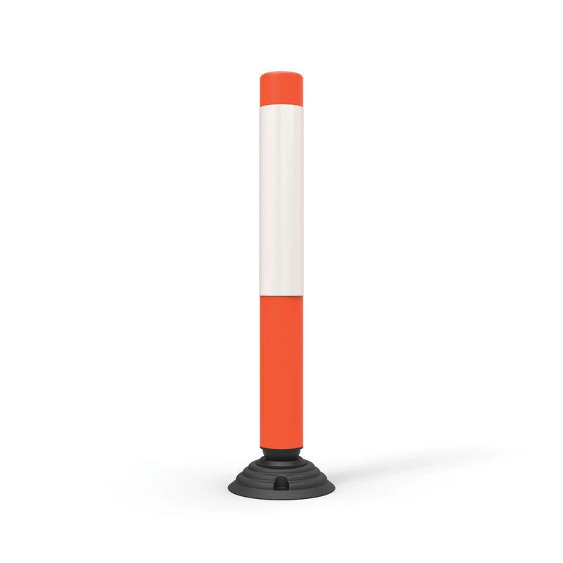 Two-piece rebound bollard with an elasticised joint for temporary or permanent delineator applications. Removable bollard post twist-locks into base. Post comes with reflective bands. The bollard is manufactured from fluorescent orange polyethylene. The rubber base is easily installed with epoxy or masonry anchors.